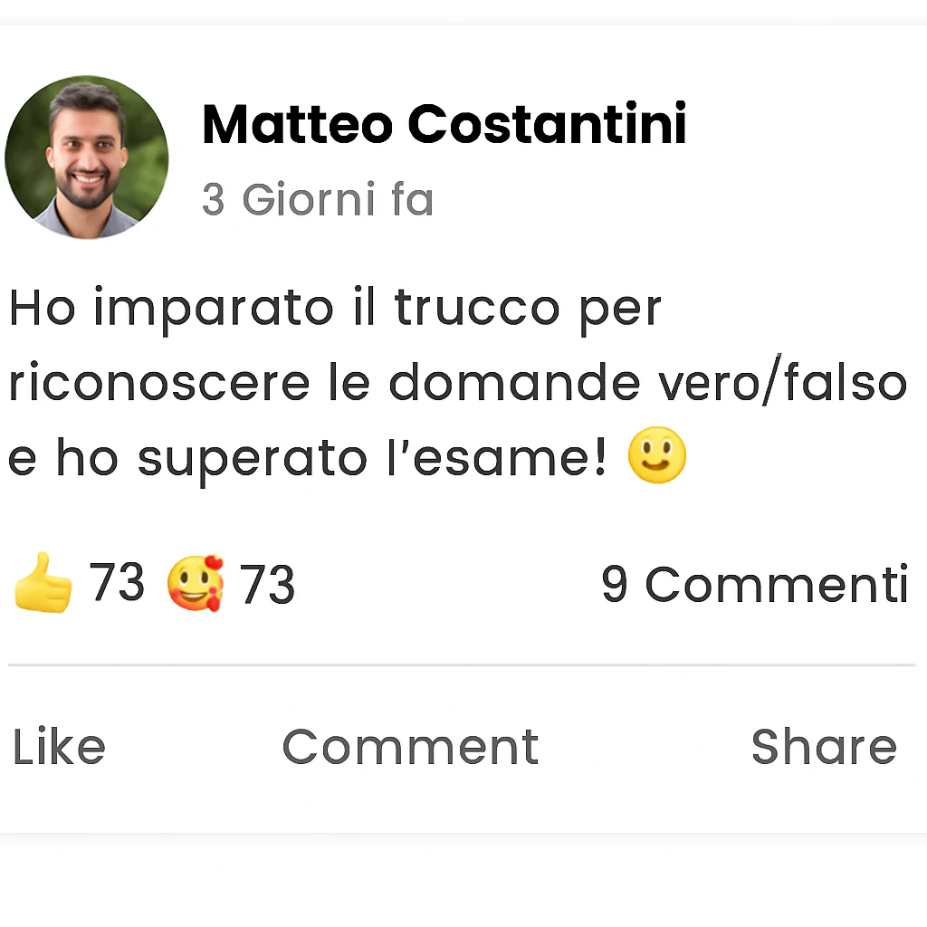 Il nostro E-book in PDF è super semplice da seguire: in poche ore ti insegna un metodo chiaro per capire al volo se un quiz è giusto o sbagliato.